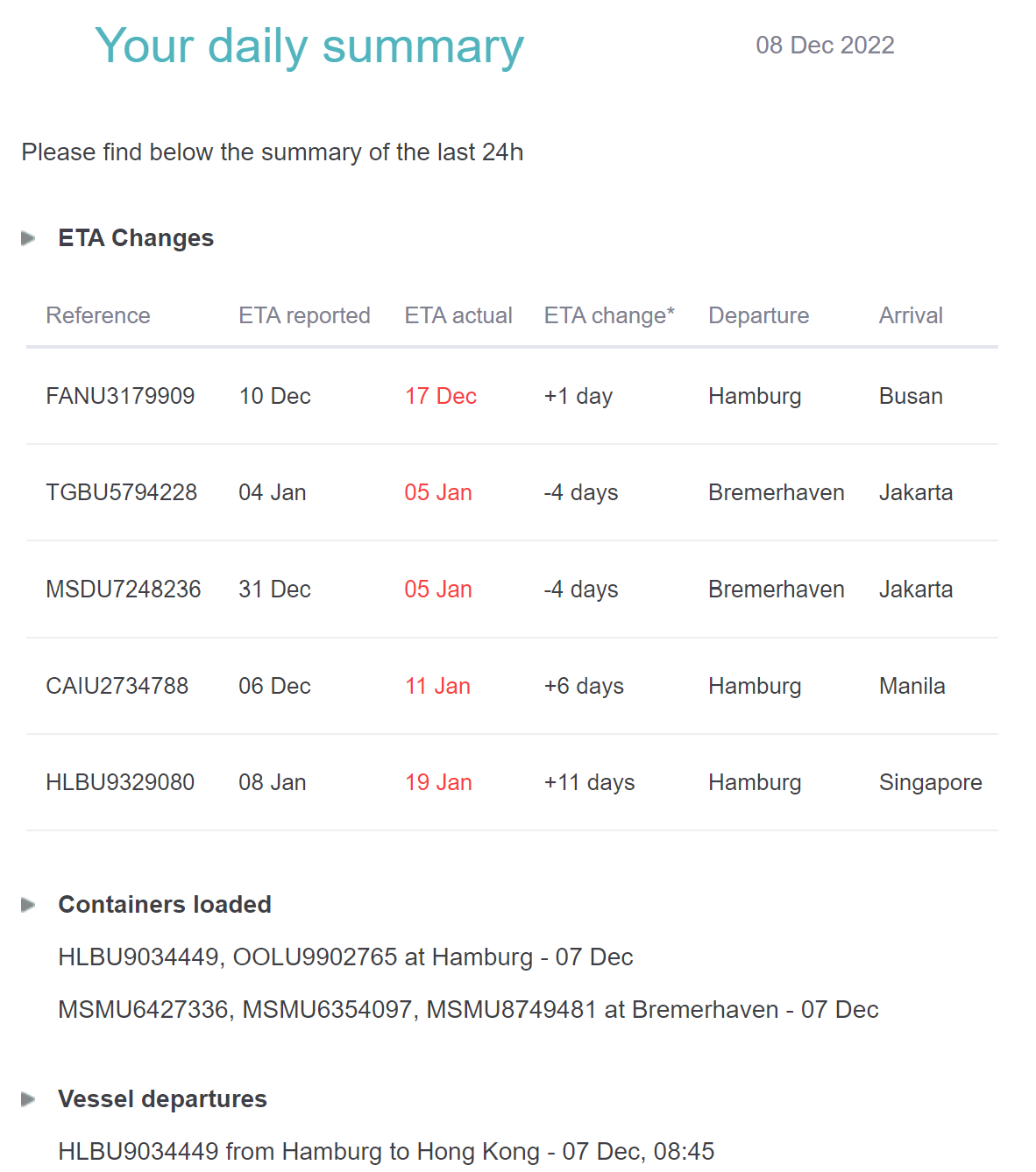 Sie werden über abgeschlossene Meilensteine oder Änderungen von ETD/ETA benachrichtigt, die in den letzten 24 Stunden stattgefunden haben, d. h. alle Änderungen, die zwischen der gestrigen und der aktuellen Daily Summary auftreten.