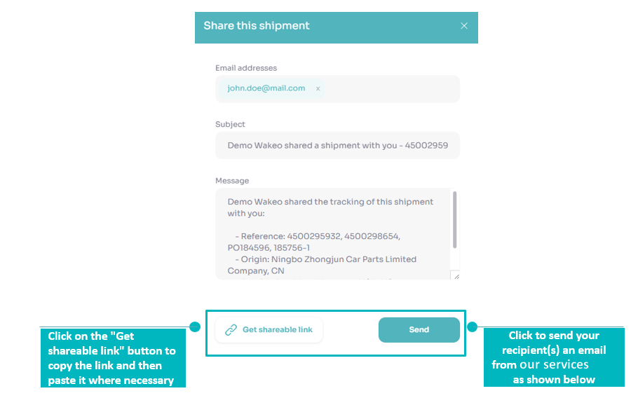 Die Funktion „Teilen“ ermöglicht es jedem Benutzer, relevante Informationen zu einer Sendung aus dem Wakeo-Konto zu teilen.