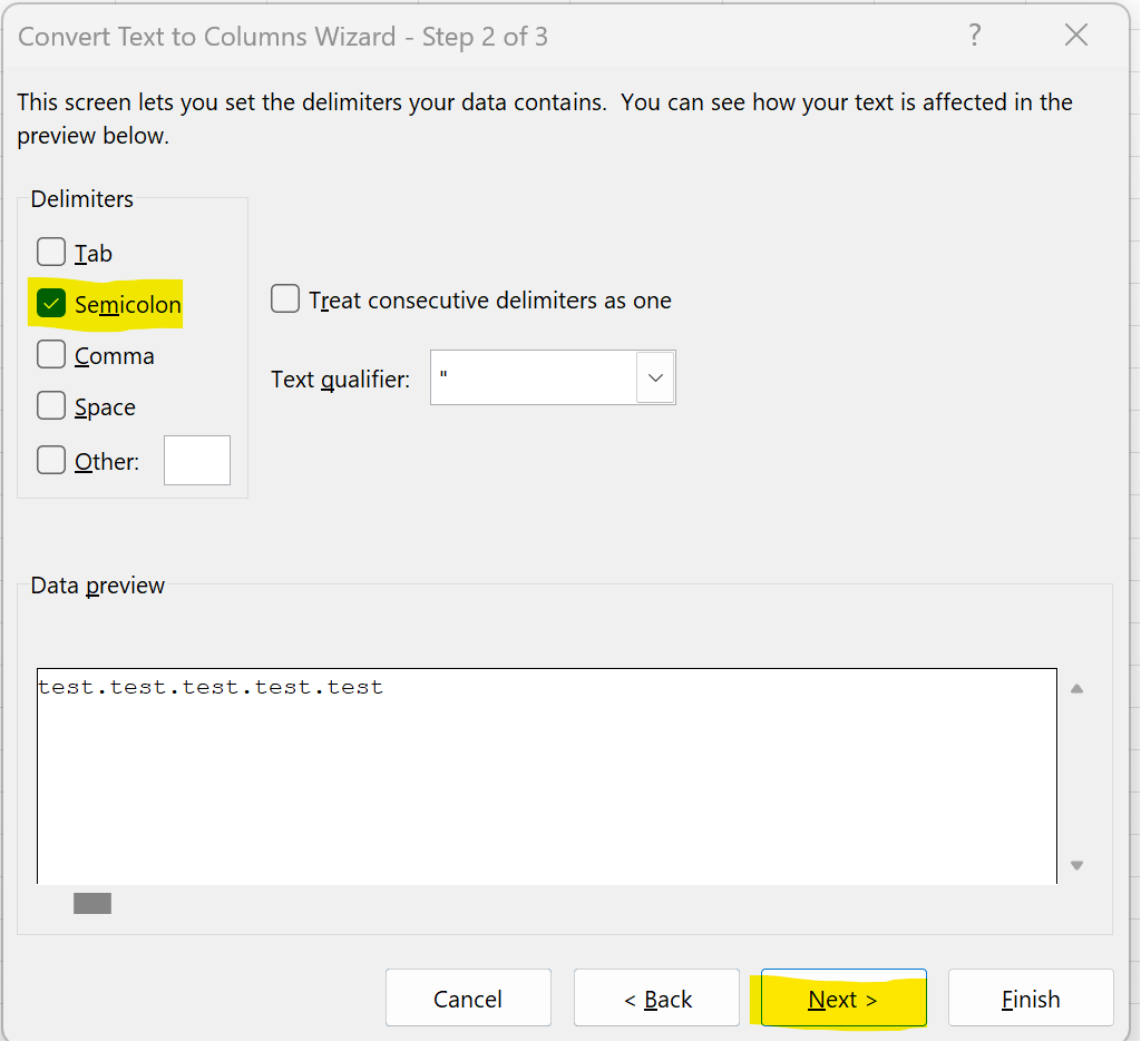 Wählen Sie „Semikolon“ und deaktivieren Sie alle anderen Optionen, klicken Sie dann auf „Weiter“.