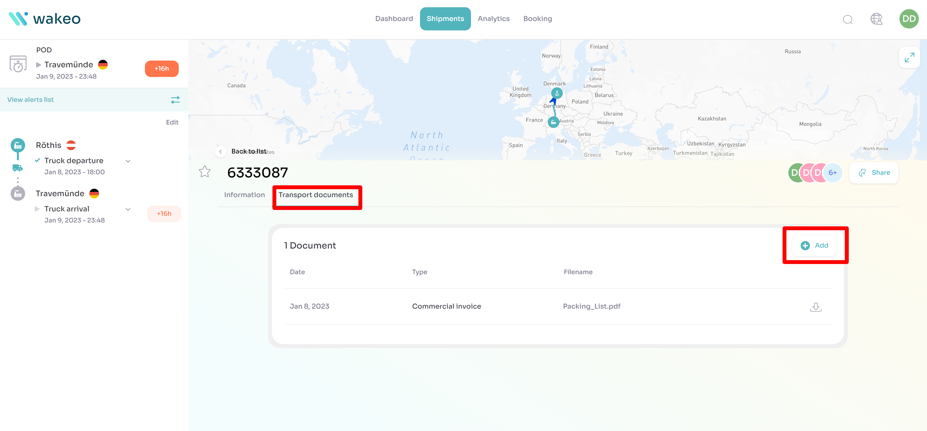 Das Hinzufügen von Dokumenten zu den Details Ihrer Sendungen ermöglicht es Ihnen, vollständige Informationen auf Wakeo zu haben und alle Daten, die Sie zu einer Fracht haben, zusammenzuführen.