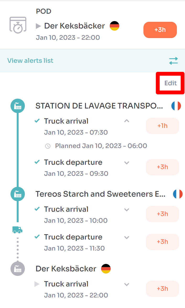 Wenn Sie eine Logistikrolle haben, haben Sie die Möglichkeit, die Abfahrts- oder Ankunftsdaten (angepasst und real) zu ändern.