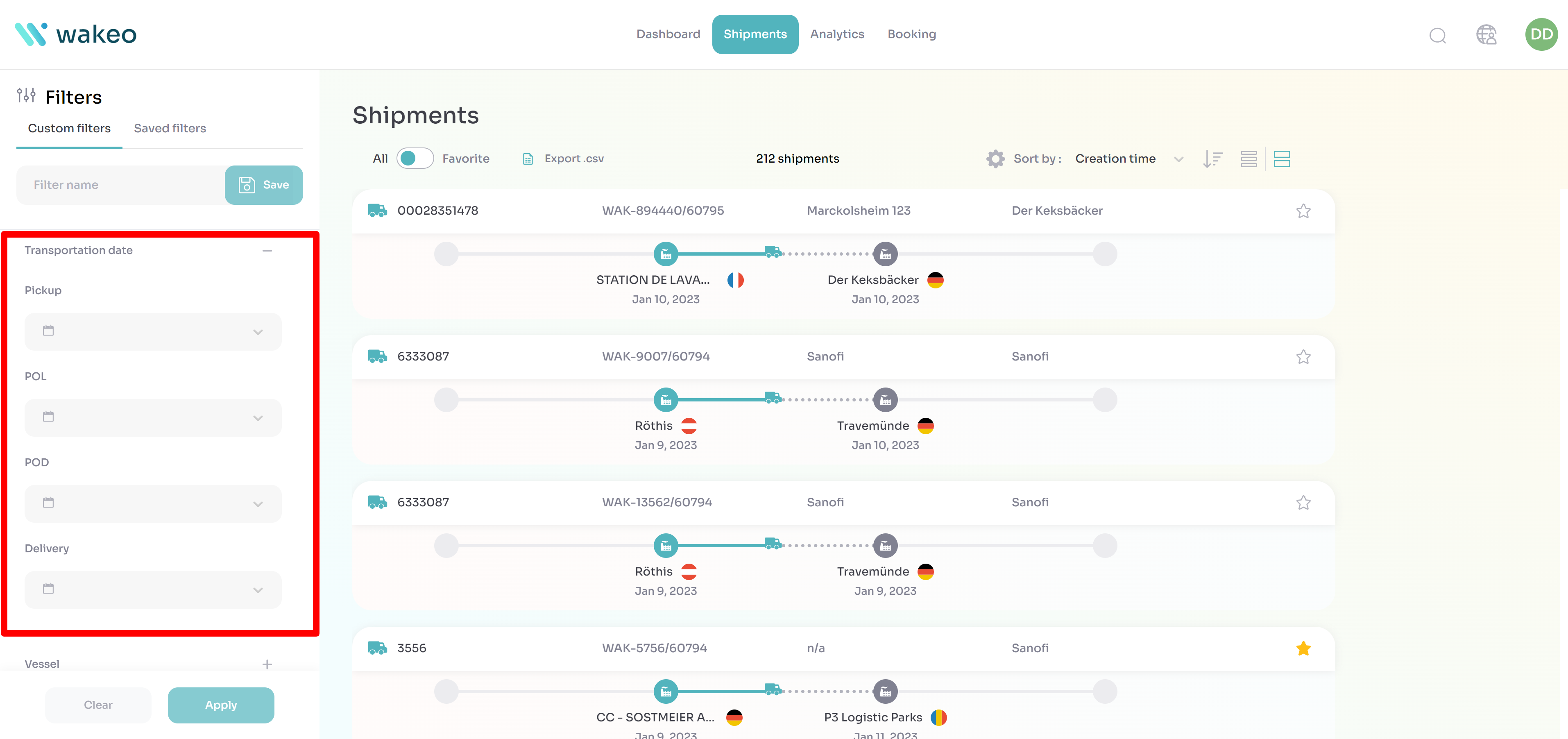 Sie können die Filter links im Tab „Sendungen“ verwenden, um die Liste der Frachten zu suchen, deren Ankunft in einem definierten Zeitintervall geplant ist. Klicken Sie dazu auf den Filter „Transportdatum“.