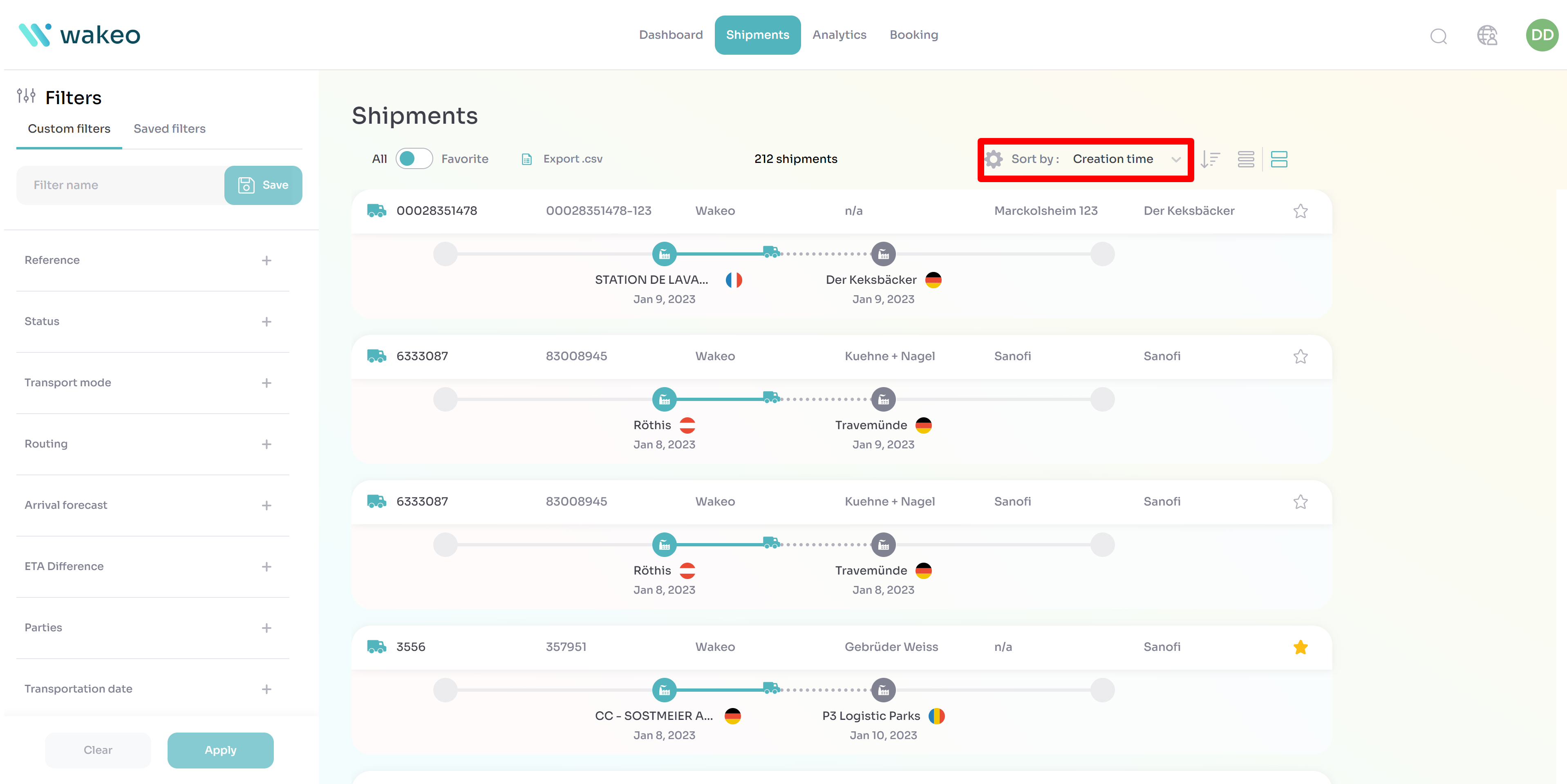 Um die Sendungen nach Erstellungszeit in der Plattform zu überprüfen, gehen Sie zum Tab ‚Sendungen‘ und wählen Sie ‚Erstellungsdatum‘ im Dropdown-Menü ‚Sortieren nach‘.